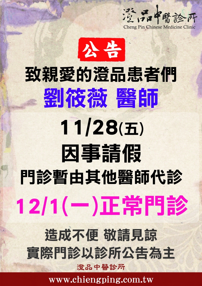 活動期間:[2025-11-13~2025-12-01]診所公告《澄品公告》劉筱薇 醫師 11/28(五) 因事請假12/1(一)正常門診